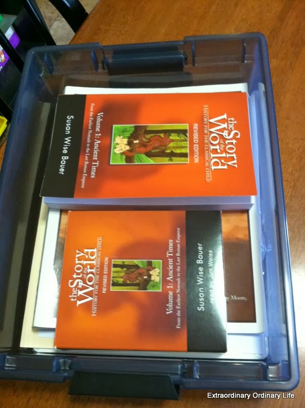 I keep the activity book, the audio CD's, the book and the lapbook and our timeline figures in there.