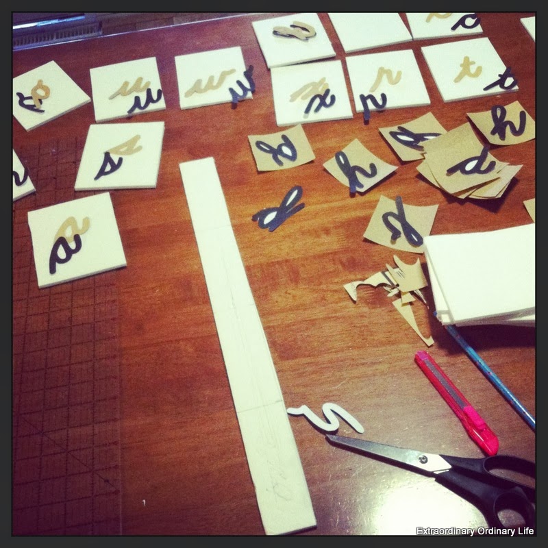 I did the vowels in pink using Modge Podge.  I have been having my older son (who is learning cursive) trace the letters with his  hands and then write it.